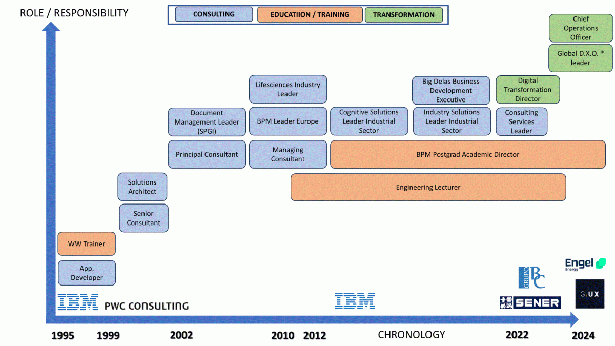 J'ai décidé de volontairement quitter IBM en 2021 et j'ai entamé mon chapitre professionnel le plus récent à ce jour. J'ai d'abord assumé les fonctions de responsable de la ligne de services de conseil chez Sener Ingénierie, un ancien client d'IBM, puis de directeur de la transformation numérique chez Grupo BC Global Services et, plus récemment, de directeur des opérations chez Engel Energy.